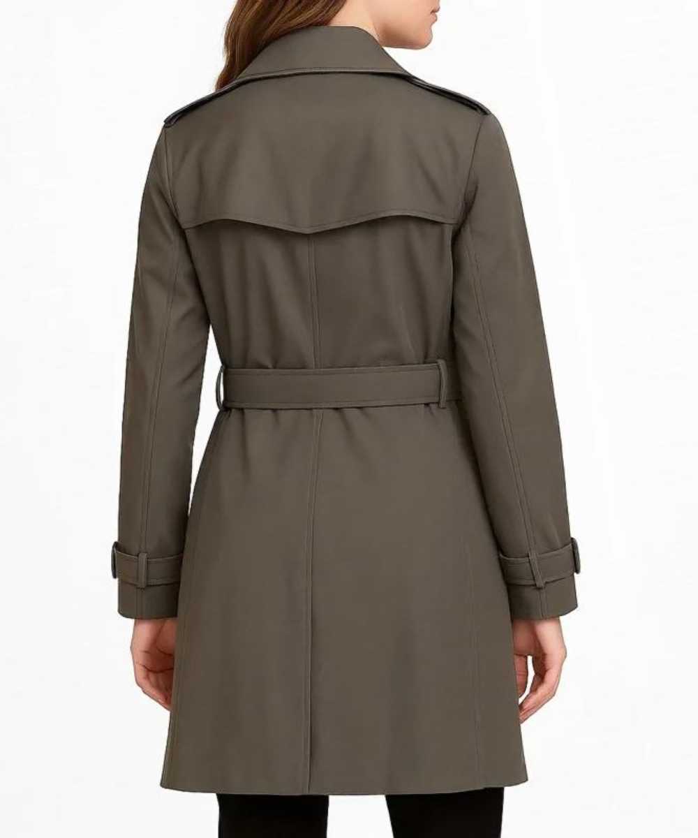 Front: Double breasted buttoned closure with a self-tied belt